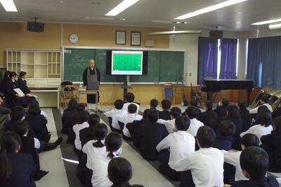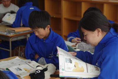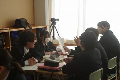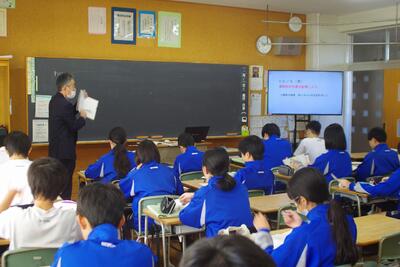 先生を中心に子供たちが資料を基に、自分の意見を活発に発言する楽しい授業でした。