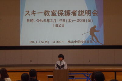26.01.15 スキー教室保護者説明会 投稿: 鳩山中 (16:43) 1月15日(木)スキー教室保護者説明会が行われ、2月19日から1泊2日で行くスキー教室に向け、行程や持ち物、費用についての説明を行いました。 特に健康管理には充分に留意していただき、できるだけ多くの生徒が元気に行ってこられるよう願っています。 Tweet -
